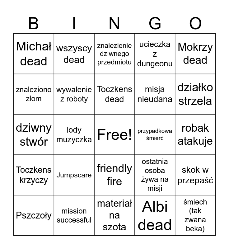 This bingo card has a free space and 24 words: Pszczoły, Jumpscare, Toczkens dead, Albi dead, Mokrzy dead, Michał dead, wszyscy dead, znalezienie dziwnego przedmiotu, przypadkowa śmierć, robak atakuje, dziwny stwór, wywalenie z roboty, ostatnia osoba żywa na misji, skok w przepaść, znaleziono złom, mission successful, materiał na szota, ucieczka z dungeonu, działko strzela, Toczkens krzyczy, lody muzyczka, friendly fire, misja nieudana and śmiech (tak zwana beka).