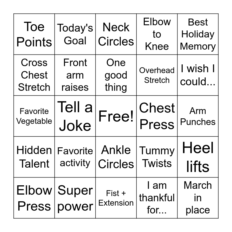 This bingo card has a free space and 32 words: I am thankful for..., Shoulder Circles, Tell a Joke, 3 deep breaths, Hidden Talent, Front arm raises, Best Holiday Memory, Heel lifts, Today's Goal, Wrist Circles, One good thing, Neck Circles, Side Arm raises, I am proud of..., Chest Press, Favorite Fruit, Elbow Press, Favorite Vegetable, Ankle Circles, Favorite activity, Tummy Twists, Favorite place, Arm Punches, Super power, March in place, Elbow to Knee, Overhead Stretch, Cross Chest Stretch, Toe Points, Fist + Extension, Straight arm clap and I wish I could....