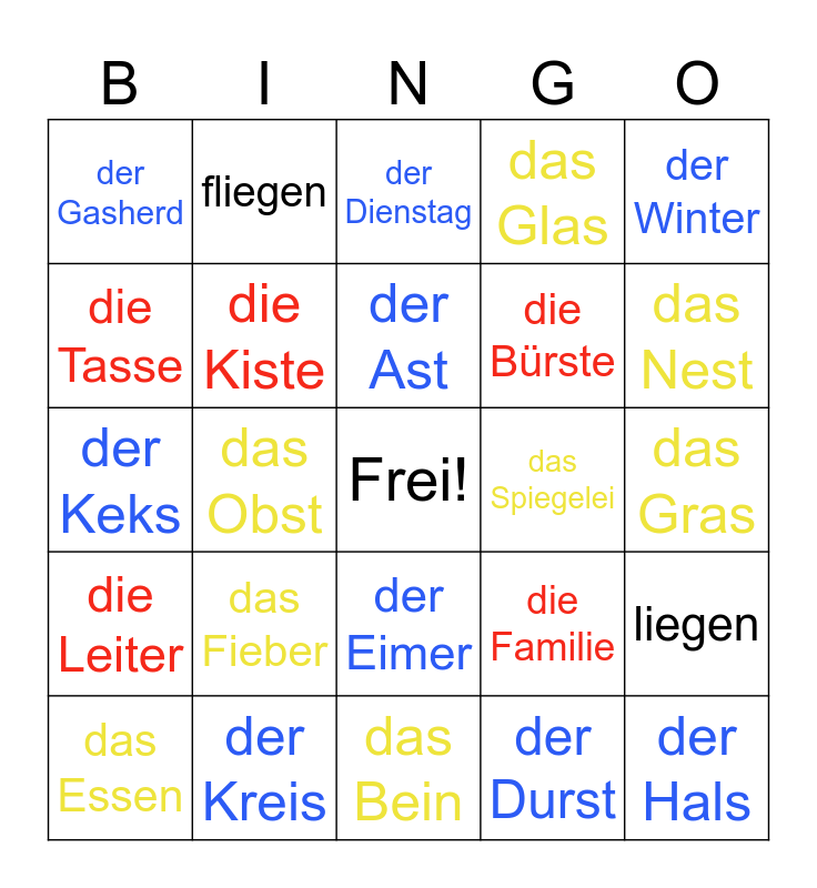 This bingo card has a free space and 24 words: das Fieber, der Kreis, der Ast, das Essen, der Winter, der Gasherd, die Tasse, fliegen, das Spiegelei, der Eimer, die Bürste, der Keks, die Familie, liegen, die Kiste, der Durst, das Gras, der Dienstag, das Nest, das Obst, der Hals, die Leiter, das Glas and das Bein.