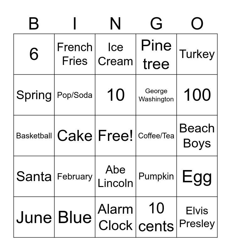 This bingo card has a free space and 24 words: February, Blue, 10, June, Turkey, 6, Spring, French Fries, Coffee/Tea, Abe Lincoln, George Washington, Basketball, Pumpkin, Egg, Pop/Soda, 10 cents, Beach Boys, Ice Cream, 100, Cake, Elvis Presley, Santa, Pine tree and Alarm Clock.