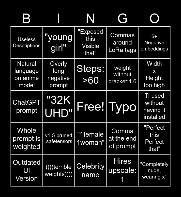 This bingo card has a free space and 24 words: v1-5-pruned .safetensors, ((((terrible weights)))), Steps: >60, Outdated UI Version, 6+ Negative embeddings, Useless Descriptions, Natural language on anime model, "young girl", Typo, "1female 1woman", weight without bracket:1.6, ChatGPT prompt, Comma at the end of prompt, "Perfect this Perfect that", Overly long negative prompt, Hires upscale: 1, TI used without having it installed, "Exposed this Visible that", Width x Height too high, "32K UHD", "Completely nude, wearing x", Whole prompt is weighted, Commas around LoRa tags and Celebrity name.
