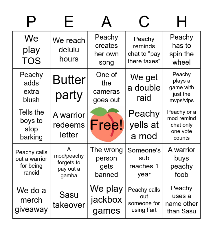 This bingo card has a free space and 40 words: Peachy tells the apple watch to stop telling her to stand, Tells the boys to stop barking, Peachy forgets to unmute, Butter party, Sasu takeover, The wrong person gets banned, One of the cameras goes out, Peachy asks for a tea, Peachy has to spin the wheel, Peachy calls out a warrior for being rancid, A warrior redeems letter, Peachy reminds chat to "pay there taxes", Peachy uses a name other than Sasu, Peachy or a mod remind chat only one vote counts, Peachy yells at a mod, A mod/peachy forgets to pay out a gamba, A sound alert doesn't work correctly, We play TOS, We do unban requests, Peachy creates her own song, A warrior buys peachy foob, Peachy calls out someone for using !fart, We get a double raid, Peachy adds extra blush, Barbie calls out Peachy for being impasta, Peachy refers to a pet as a "little guy", Peachy falls, The subathon gets extended, Peachy plays a horror game, Someone asks peachy for a makeup tutorial, We reach an incentive involving Sasu, We do a merch giveaway, Peachy reminisces about the past, Someone's sub reaches 1 year, Peachy plays a game with just the mvps/vips, We play jackbox games, Peachy acts like an ai streamer, Onion says something out of pocket, We reach delulu hours and Peachy makes a face into a creeper cam.