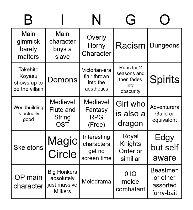 This bingo card has a free space and 29 words: OP main character, 6 gorillion year old loli, Medievel Flute and String OST, Bad CGI, Main gimmick barely matters, Overly Horny Character, Demons, Magic Circle, Girl who is also a dragon, Big Honkers absolutely just massive Milkers, Adventurers Guild or equivalent, Beastmen or other assorted furry-bait, Melodrama, 0 IQ melee combatant, Spirits, Chocobo or ground dragon mount, Interesting characters get no screen time, Skeletons, Dungeons, Worldbuilding is actually good, Royal Knights Order or simillar, Uninspired boring fights, Runs for 2 seasons and then fades into obscurity, Takehito Koyasu shows up to be the villain, Racism, Main character buys a slave, Edgy but self aware, Victorian-era flair thrown into the aesthetics and Le goblins have arrived.