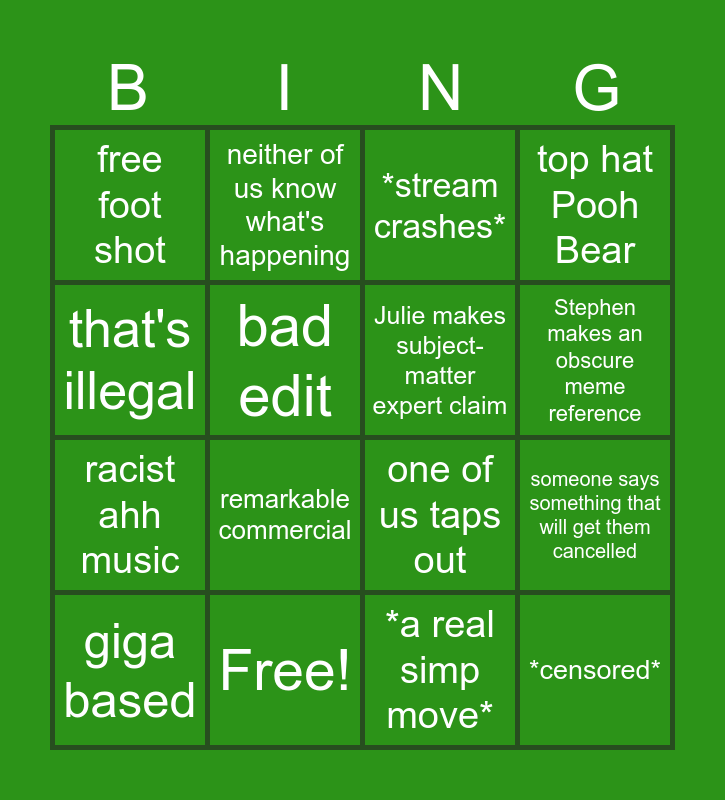This bingo card has 16 words: Free!, someone says something that will get them cancelled, *stream crashes*, free foot shot, racist ahh music, neither of us know what's happening, one of us taps out, *a real simp move*, that's illegal, bad edit, giga based, top hat Pooh Bear, remarkable commercial, Stephen makes an obscure meme reference, Julie makes subject-matter expert claim and *censored*.