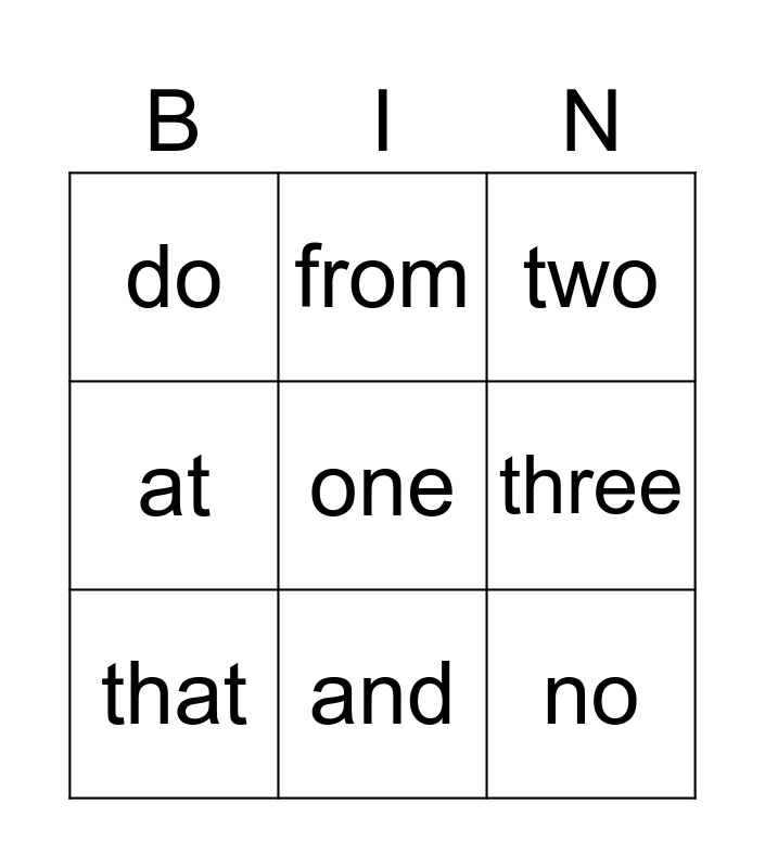 This bingo card has a free space and 11 words: all, and, no, that, from, two, three, it, at, do and my.