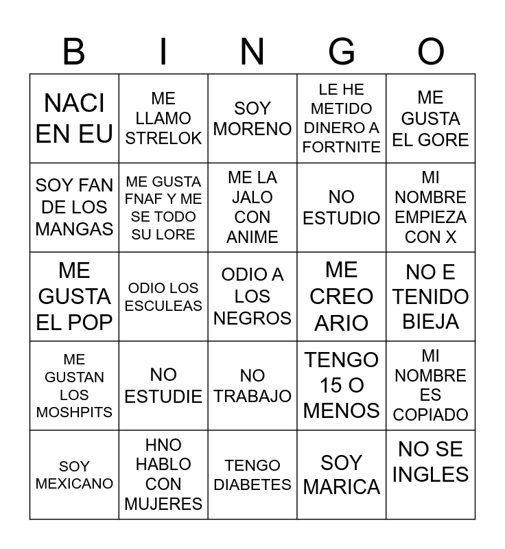 This bingo card has a free space and 24 words: SOY MEXICANO, NO ESTUDIE, ME LA JALO CON ANIME, SOY MARICA, ME GUSTA EL GORE, NACI EN EU, ME LLAMO STRELOK, SOY MORENO, ME CREO ARIO, NO E TENIDO BIEJA, ME GUSTA EL POP, ME GUSTA FNAF Y ME SE TODO SU LORE, TENGO 15 O MENOS, MI NOMBRE ES COPIADO, SOY FAN DE LOS MANGAS, HNO HABLO CON MUJERES, TENGO DIABETES, LE HE METIDO DINERO A FORTNITE, MI NOMBRE EMPIEZA CON X, ME GUSTAN LOS MOSHPITS, ODIO LOS ESCULEAS, NO TRABAJO, NO ESTUDIO and NO SE INGLES.