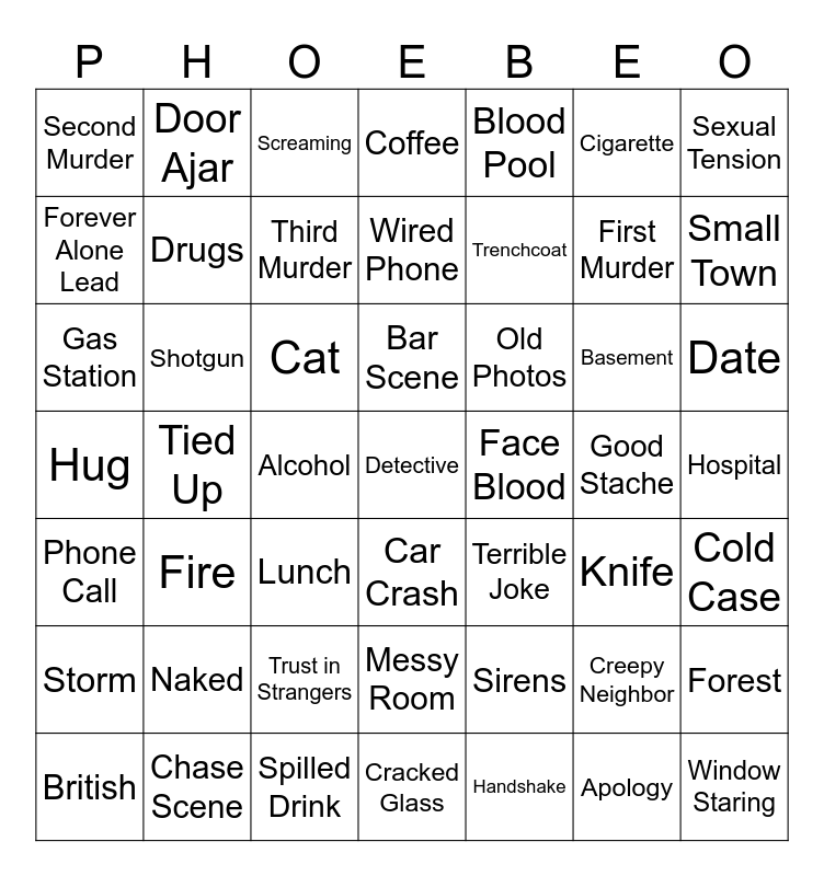 This bingo card has a free space and 48 words: Sirens, First Murder, Cracked Glass, Tied Up, Cat, Hospital, Door Ajar, Chase Scene, Cigarette, Car Crash, Sexual Tension, Coffee, Basement, Old Photos, Storm, Good Stache, Forever Alone Lead, Small Town, Creepy Neighbor, Blood Pool, Trenchcoat, Alcohol, Second Murder, Drugs, Forest, Third Murder, Date, British, Bar Scene, Shotgun, Apology, Face Blood, Cold Case, Naked, Hug, Terrible Joke, Knife, Gas Station, Lunch, Trust in Strangers, Phone Call, Window Staring, Screaming, Spilled Drink, Wired Phone, Messy Room, Fire and Handshake.