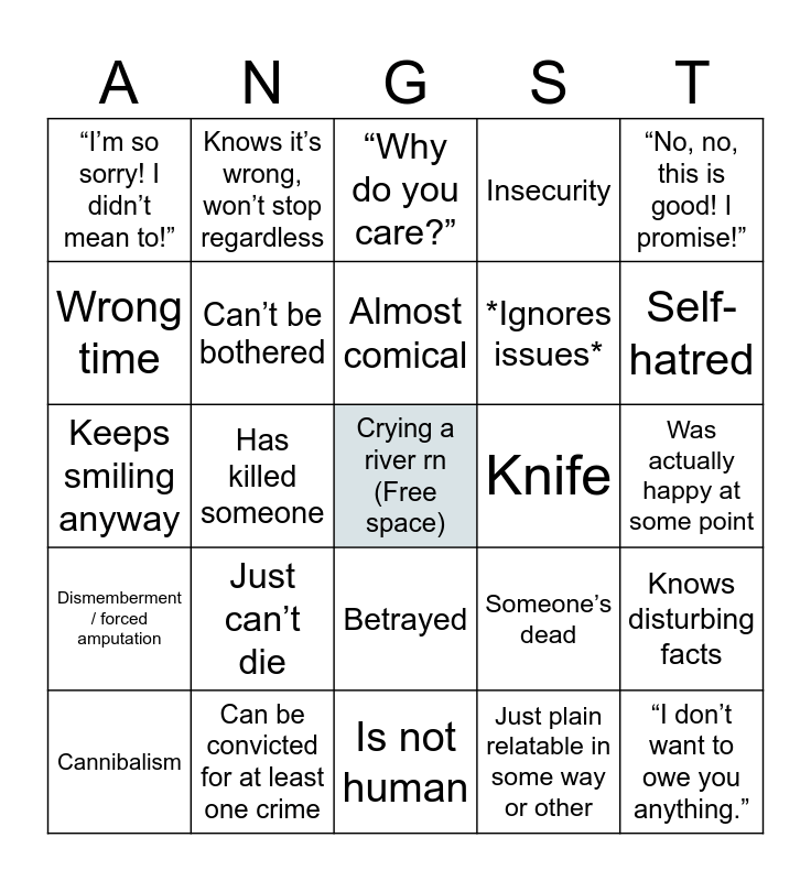 This bingo card has a free space and 24 words: Just can’t die, Can be convicted for at least one crime, Almost comical, Cannibalism, “No, no, this is good! I promise!”, “I’m so sorry! I didn’t mean to!”, Wrong time, Knows it’s wrong, won’t stop regardless, Knife, Betrayed, *Ignores issues*, Keeps smiling anyway, Someone’s dead, Knows disturbing facts, Can’t be bothered, Just plain relatable in some way or other, Was actually happy at some point, “Why do you care?”, Self-hatred, Has killed someone, “I don’t want to owe you anything.”, Dismemberment / forced amputation, Insecurity and Is not human.