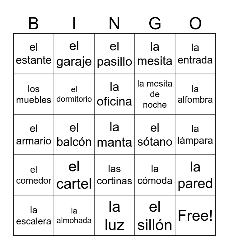 This bingo card has 33 words: Free!, el altillo, el balcón, la cocina, el comedor, el dormitorio, la entrada, la escalera, el garaje, el jardín, la oficina, el pasillo, el patio, la sala, el sótano, la alfombra, la almohada, el armario, el cartel, la cómoda, las cortinas, el cuadro, el estante, la lámpara, la luz, la manta, la mesita, la mesita de noche, los muebles, la pared, la pintura, el sillón and el sofá.