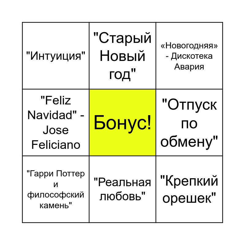This bingo card has a free space and 13 words: "Last Christmas" - Wham!, "Один дома", "Гарри Поттер и философский камень", "Старый Новый год", "Feliz Navidad" - Jose Feliciano, "Крепкий орешек", "Ирония судьбы или с легким паром", "All I Want for Christmas Is You" - Mariah Carey, "Реальная любовь", "Интуиция", "Отпуск по обмену", «Новогодняя» - Дискотека Авария and «Пять минут» - Людмила Гурченко.