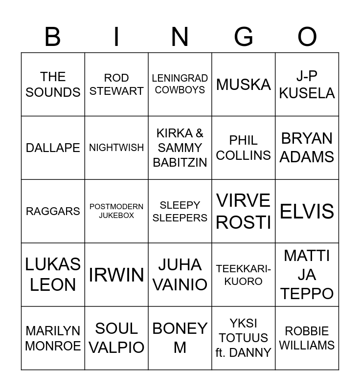This bingo card has 31 words: BONEY M, PORTION BOYS, POSTMODERN JUKEBOX, WALLU VALPIO, THE SOUNDS, LENINGRAD COWBOYS, NIGHTWISH, TEEKKARI-KUORO, VIRVE ROSTI, YKSI TOTUUS ft. DANNY, ELVIS, SLEEPY SLEEPERS, ROBBIE WILLIAMS, MICHAEL JACKSON, BRYAN ADAMS, KARI TAPIO, MATTI JA TEPPO, IRWIN, LUKAS LEON, JUHA VAINIO, J-P KUSELA, ANNA ERIKSSON, MARILYN MONROE, ROD STEWART, PHIL COLLINS, DALLAPE, MUSKA, RAGGARS, SOUL VALPIO, KIRKA & SAMMY BABITZIN and AMI ASPELUND.