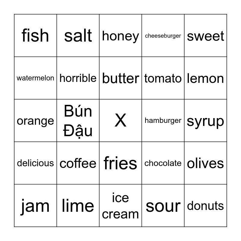 This bingo card has a free space and 34 words: salty, sour, oily, bitter, delicious, horrible, sweet, jam, salt, peanut, butter, honey, pepper, pizza, hamburger, lemon, lime, orange, coffee, chocolate, fries, chicken, fish, syrup, ice cream, donuts, cheeseburger, salad, tomato, watermelon, broccoli, Bún Đậu, olives and strawberry.
