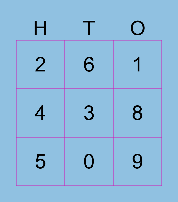 This bingo card has 10 words: 0, 1, 2, 3, 4, 5, 6, 7, 8 and 9.