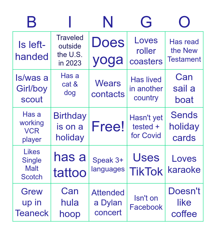 This bingo card has a free space and 24 words: has a tattoo, Can hula hoop, Wears contacts, Grew up in Teaneck, Has read the New Testament, Is left-handed, Is/was a Girl/boy scout, Traveled outside the U.S. in 2023, Hasn't yet tested + for Covid, Speak 3+ languages, Has lived in another country, Has a working VCR player, Uses TikTok, Loves karaoke, Has a cat & dog, Isn't on Facebook, Sends holiday cards, Does yoga, Can sail a boat, Birthday is on a holiday, Doesn't like coffee, Likes Single Malt Scotch, Loves roller coasters and Attended a Dylan concert.