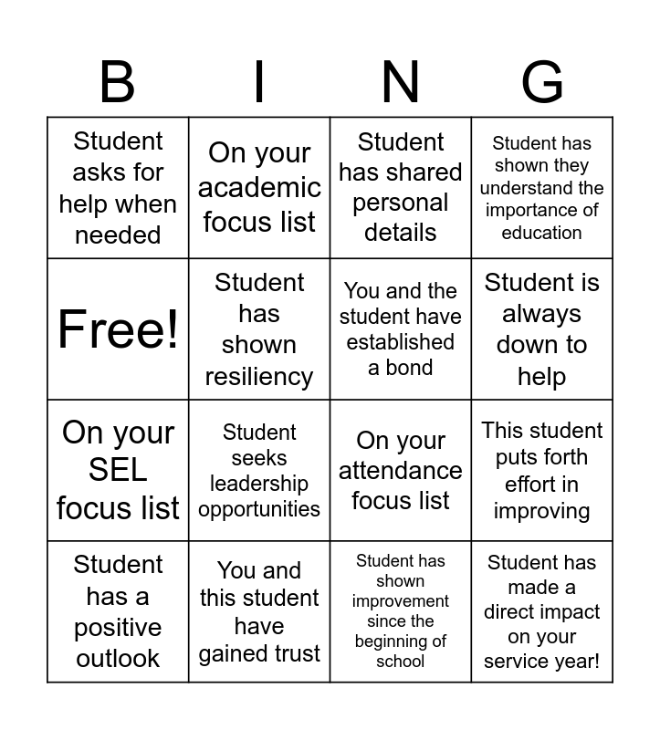 This bingo card has 16 words: You and this student have gained trust, This student puts forth effort in improving, Student has shared personal details, Student asks for help when needed, On your SEL focus list, On your academic focus list, On your attendance focus list, Student has shown improvement since the beginning of school, Free!, Student has shown resiliency, Student has a positive outlook, Student has shown they understand the importance of education, Student seeks leadership opportunities, Student is always down to help, You and the student have established a bond and Student has made a direct impact on your service year!.