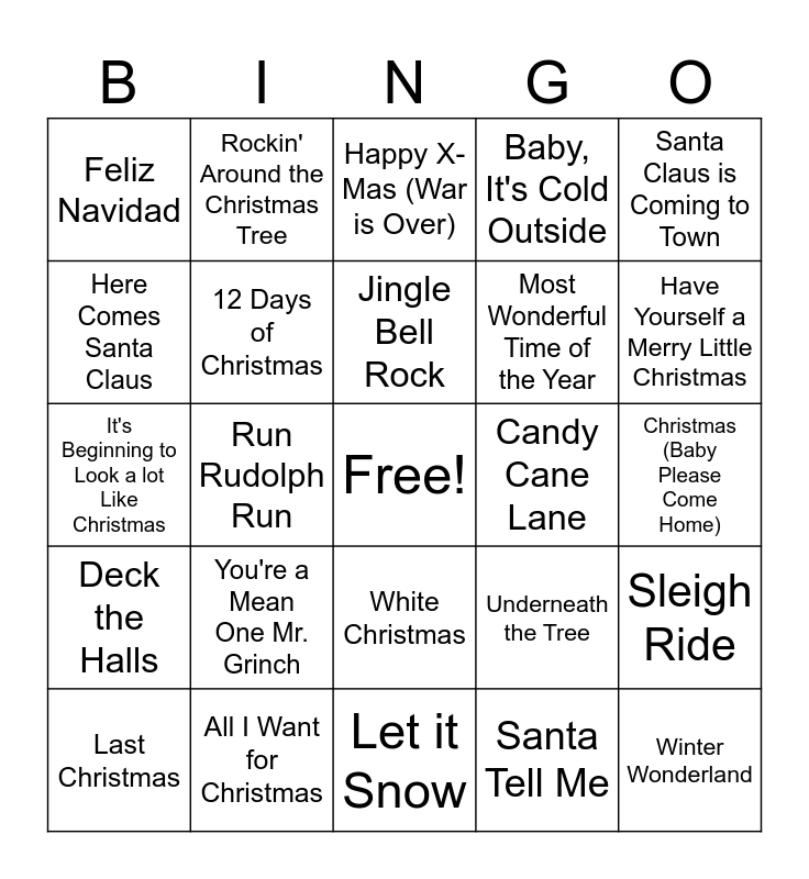 This bingo card has a free space and 24 words: You're a Mean One Mr. Grinch, All I Want for Christmas, Jingle Bell Rock, Last Christmas, Santa Claus is Coming to Town, Feliz Navidad, Here Comes Santa Claus, Rockin' Around the Christmas Tree, Candy Cane Lane, White Christmas, Most Wonderful Time of the Year, It's Beginning to Look a lot Like Christmas, Underneath the Tree, Sleigh Ride, 12 Days of Christmas, Santa Tell Me, Christmas (Baby Please Come Home), Happy X-Mas (War is Over), Have Yourself a Merry Little Christmas, Run Rudolph Run, Winter Wonderland, Deck the Halls, Baby, It's Cold Outside and Let it Snow.