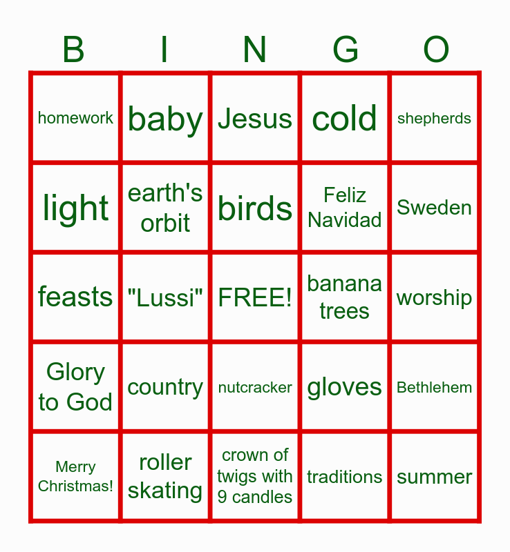 This bingo card has a free space and 79 words: Mexico, Posadas, Jesus, peace, love offering, home, candlelight, mango trees, teacher, Australia, school project, vacation, cold, homework, clowns, light, Germany, country, December, worship, Silent Night, shepherds, feasts, birds, earth's orbit, Austria, students, southern hemisphere, circus, Mary, Sweden, January, crown of twigs with 9 candles, New Year's Day, Merry Christmas!, banana trees, Puerto Rico, holiday assignment, winter, summer, church, Christmas carol, Christ child, the world, Congo, Africa, baby, stars, Caracas, Venezuela, beach, Christmas Eve services, Bethlehem, "Lussi", gloves, Ireland, Epiphany, wise men, manger, Light of the world, Russia, nutcracker, Feliz Navidad, candles, St. Lucia Day, Savior, good news!, Nativity scene, Joy, Joseph, newborn King, Glory to God, roller skating, angel, Italy, the Lord, ballerina, traditions, News Station, reporters and India.