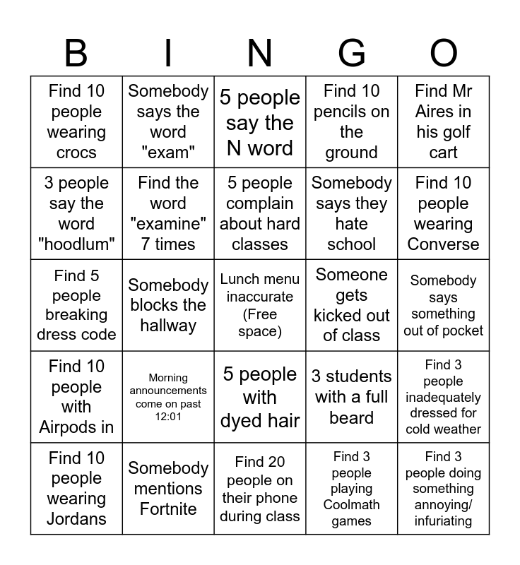 This bingo card has a free space and 27 words: 3 students with a full beard, Find a group making Tiktoks, Somebody says they hate school, Find 20 people on their phone during class, 3 people say the word "hoodlum", 5 people say the N word, Somebody says the word "exam", Find 10 people with Airpods in, Someone gets kicked out of class, Find 3 people inadequately dressed for cold weather, Find 5 people breaking dress code, Find 10 pencils on the ground, Find 10 people wearing Jordans, Somebody mentions Fortnite, Find 10 people wearing Converse, Somebody says "Powerschool", Find the word "examine" 7 times, 5 people complain about hard classes, Morning announcements come on past 12:01, Find 10 people wearing crocs, Somebody says something out of pocket, Find 3 people playing Coolmath games, Somebody blocks the hallway, Find 3 people doing something annoying/ infuriating, 5 people with dyed hair, Find Mr Aires in his golf cart and Find someone with their pants below their underwear.