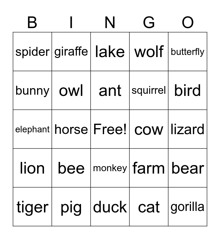 This bingo card has a free space and 24 words: bee, pig, ant, tiger, butterfly, spider, bunny, giraffe, cow, monkey, squirrel, elephant, farm, bear, owl, cat, lizard, lake, bird, horse, gorilla, lion, wolf and duck.