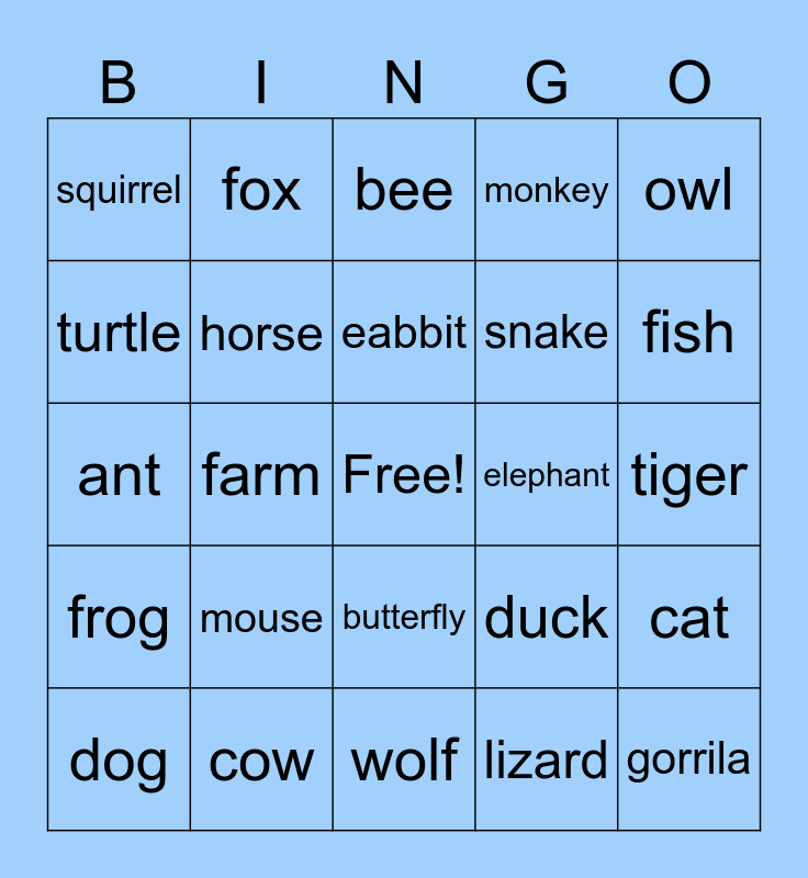 This bingo card has a free space and 29 words: pig, cow, bee, spider, owl, squirrel, horse, eabbit, elephant, cat, dog, farm, lizard, gorrila, ant, lionq, wolf, duck, fish, frog, mouse, rat, snake, tiger, turtle, fox, butterfly, monkey and bear.