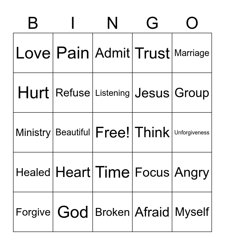This bingo card has a free space and 24 words: Heart, God, Listening, Forgive, Marriage, Love, Hurt, Pain, Think, Time, Jesus, Ministry, Focus, Angry, Refuse, Afraid, Unforgiveness, Admit, Group, Beautiful, Myself, Healed, Trust and Broken.