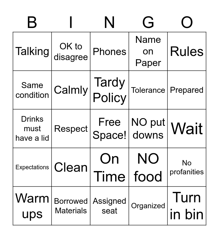 This bingo card has a free space and 29 words: Warm ups, School wide policies, Respect, Prepared, Talking, Phones, Calmly, Clean, NO put downs, Borrowed Materials, Wait, Turn in bin, Assigned seat, Organized, Prepared, "I statements”, On Time, Expectations, Rules, Drinks must have a lid, NO food, Voice Volume, Tolerance, Same condition, Name on Paper, OK to disagree, No profanities, Tardy Policy and School wide policies.