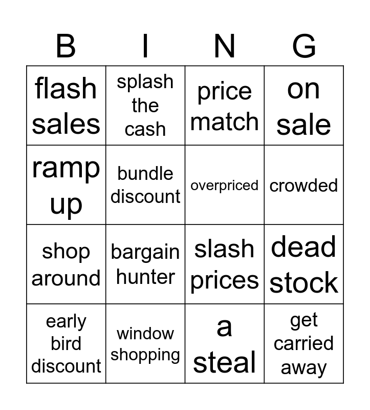 This bingo card has 16 words: window shopping, dead stock, price match, flash sales, shop around, splash the cash, slash prices, a steal, ramp up, bundle discount, early bird discount, on sale, bargain hunter, crowded, overpriced and get carried away.