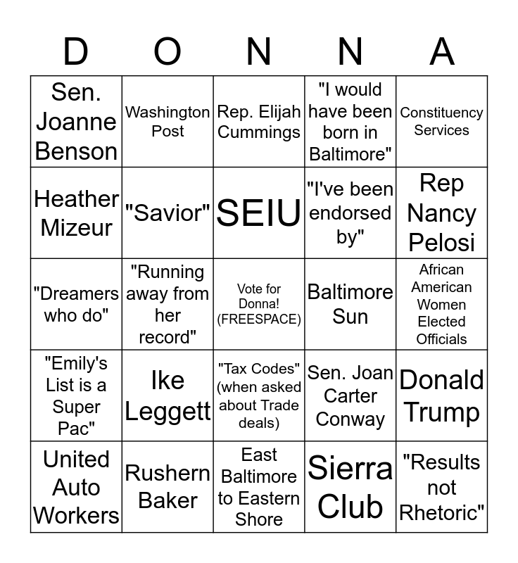 This bingo card has a free space and 24 words: Ike Leggett, Rushern Baker, SEIU, United Auto Workers, Constituency Services, Sen. Joanne Benson, Heather Mizeur, Washington Post, Baltimore Sun, "Tax Codes" (when asked about Trade deals), "I've been endorsed by", "Dreamers who do", Sen. Joan Carter Conway, Donald Trump, "Savior", Sierra Club, African American Women Elected Officials, Rep. Elijah Cummings, Rep Nancy Pelosi, "Running away from her record", "Results not Rhetoric", "Emily's List is a Super Pac", "I would have been born in Baltimore" and East Baltimore to Eastern Shore.