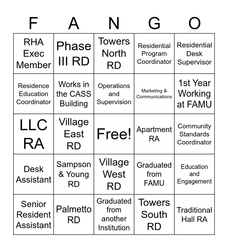 This bingo card has a free space and 24 words: Sampson & Young RD, Palmetto RD, Operations and Supervision, Senior Resident Assistant, Residential Desk Supervisor, RHA Exec Member, Residence Education Coordinator, Phase III RD, Apartment RA, Village West RD, Marketing & Communications, LLC RA, Graduated from FAMU, Education and Engagement, Works in the CASS Building, Towers South RD, Community Standards Coordinator, Towers North RD, 1st Year Working at FAMU, Village East RD, Traditional Hall RA, Desk Assistant, Residential Program Coordinator and Graduated from another Institution.