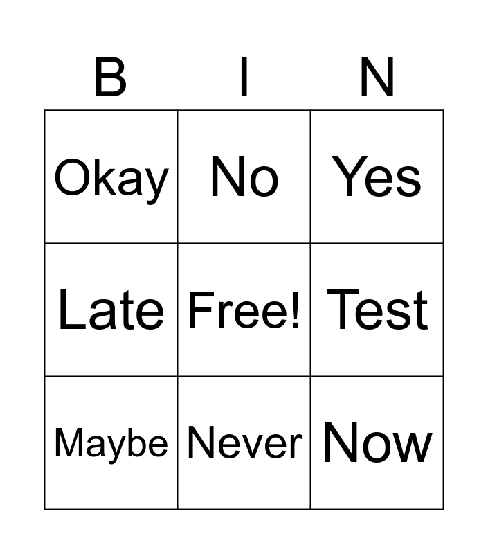 This bingo card has a free space and 8 words: Test, Yes, No, Maybe, Okay, Now, Late and Never.