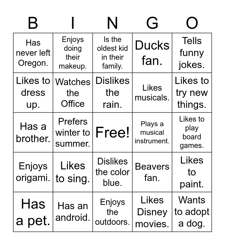 This bingo card has a free space and 29 words: Has a pet., Has been to another country., Prefers winter to summer., Has a sibling., Has never left Oregon., Is the oldest kid in their family., Watches the Office, Likes to sing., Plays a musical instrument., Has an android., Likes to play board games., Wants to adopt a dog., Enjoys the outdoors., Likes Disney movies., Likes to try new things., Has a nickname., Dislikes the color blue., Enjoys origami., Tells funny jokes., Has a brother., Beavers fan., Enjoys watching sports., Likes musicals., Likes to dress up., Ducks fan., Enjoys doing their makeup., Likes to paint., Dislikes the rain. and Doja Cat fan..