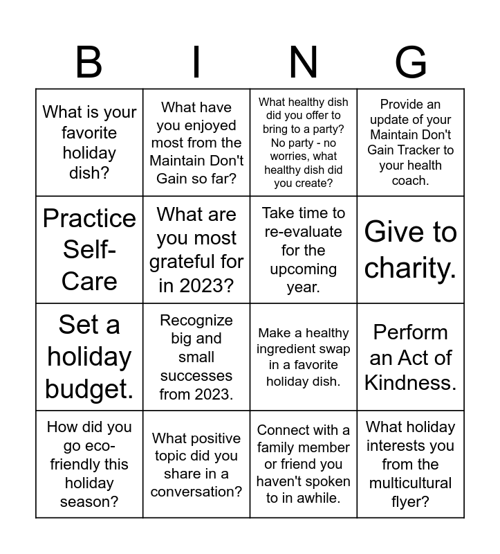 This bingo card has 18 words: Recognize big and small successes from 2023., What holiday interests you from the multicultural flyer?, What healthy dish did you offer to bring to a party? No party - no worries, what healthy dish did you create?, What is your favorite holiday dish?, Make a healthy ingredient swap in a favorite holiday dish., Provide an update of your Maintain Don't Gain Tracker to your health coach., How did you go eco-friendly this holiday season?, What have you enjoyed most from the Maintain Don't Gain so far?, Give to charity., Set a holiday budget., Connect with a family member or friend you haven't spoken to in awhile., Practice Self-Care, Perform an Act of Kindness., What are you most grateful for in 2023?, Take time to re-evaluate for the upcoming year., What fruits and vegetables did you enjoy at a holiday meal or get-together?, What positive topic did you share in a conversation? and Find the good in those around you and highlight it..