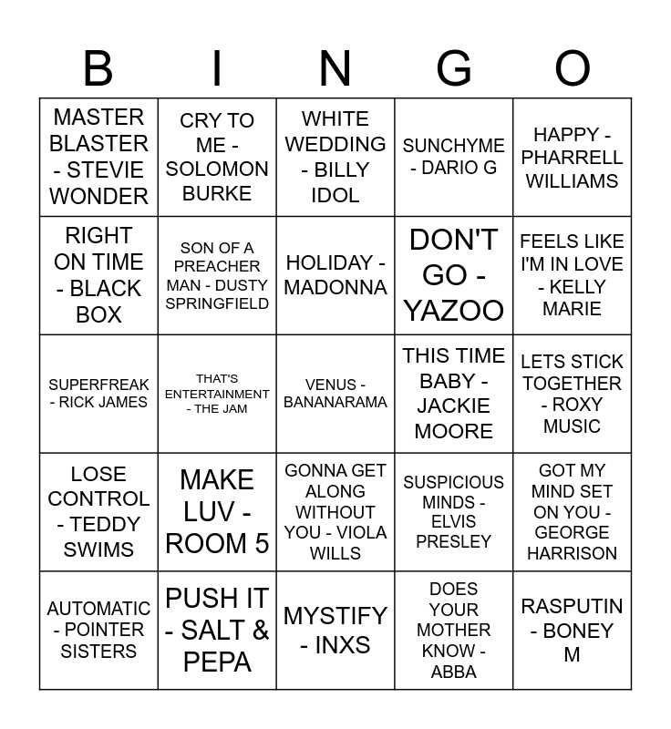 This bingo card has 50 words: RIGHT IN THE NIGHT - JAM & SPOON, VENUS - BANANARAMA, SING HALLELUJAH, MYSTIFY - INXS, MAKE LUV - ROOM 5, MUSIC SOUNDS BETTER WITH YOU - STARDUST, CRY TO ME - SOLOMON BURKE, WHY - BRONSKI BEAT, RIGHT ON TIME - BLACK BOX, BAGGY TROUSERS - MADNESS, SON OF A PREACHER MAN - DUSTY SPRINGFIELD, SUNCHYME - DARIO G, GOT MY MIND SET ON YOU - GEORGE HARRISON, SUSPICIOUS MINDS - ELVIS PRESLEY, THUNDER IN MY HEART - LEO SAYER, PICK ME UP, I'LL DANCE - MELBA MOORE, HOLIDAY - MADONNA, THIS TIME BABY - JACKIE MOORE, BREAK ON THROUGH - THE DOORS, HAPPY - PHARRELL WILLIAMS, THAT'S ENTERTAINMENT - THE JAM, DOES YOUR MOTHER KNOW - ABBA, MASTER BLASTER - STEVIE WONDER, DON'T GO - YAZOO, LOVE ON THE ROCKS - NEIL DIAMOND, RASPUTIN - BONEY M, FEELS LIKE I'M IN LOVE - KELLY MARIE, VERTIGO - U2, WHITE WEDDING - BILLY IDOL, GONNA GET ALONG WITHOUT YOU - VIOLA WILLS, GIVE A LITTLE LOVE - BAY CITY ROLLERS, JUST CANT GET ENOUGH - DEPECHE MODE, BREAK MY STRIDE - MATTHEW WILDER, SOMETIMES - ERASURE, PUSH IT - SALT & PEPA, I ONLY WANT TO BE WITH YOU - DUSTY SPRINGFIELD, KIDS IN AMERICA - KIM WILDE, BOULEVARD OF BROKEN DREAMS - GREENDAY, I GOTTA FEELING - BLACK EYED PEAS, LETS STICK TOGETHER - ROXY MUSIC, HUNGRY LIKE THE WOLF - DURAN DURAN, ON THE FLOOR - J-LO, SO LONELY - POLICE, STICK SEASON - NOAH KAHAN, AUTOMATIC - POINTER SISTERS, SUPERFREAK - RICK JAMES, GOLDEN BROWN - STRANGLERS, IT'S A HEARTACHE - BONNIE TYLER, LOSE CONTROL - TEDDY SWIMS and YOU WONT FIND ANOTHER FOOL - SEEKERS.