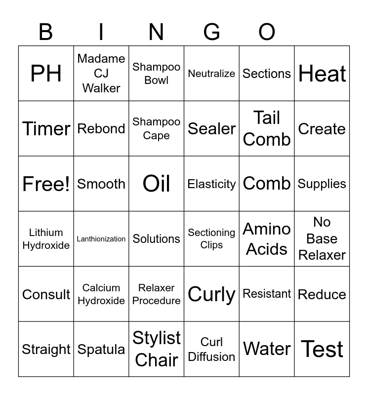 This bingo card has 36 words: Curly, Relaxer Procedure, Curl Diffusion, Timer, Lithium Hydroxide, Elasticity, Rebond, Stylist Chair, Sections, Resistant, Create, Neutralize, Reduce, Smooth, Sealer, PH, Consult, Comb, Free!, Shampoo Bowl, Oil, Lanthionization, Sectioning Clips, Solutions, Amino Acids, Madame CJ Walker, Tail Comb, Spatula, Shampoo Cape, Heat, Test, Straight, No Base Relaxer, Supplies, Calcium Hydroxide and Water.