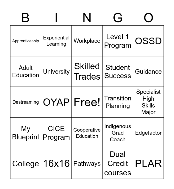 This bingo card has a free space and 24 words: CICE Program, 16x16, Skilled Trades, College, OSSD, Apprenticeship, Adult Education, Experiential Learning, Transition Planning, Cooperative Education, Student Success, Destreaming, Indigenous Grad Coach, Edgefactor, University, Dual Credit courses, Specialist High Skills Major, Workplace, Guidance, OYAP, PLAR, My Blueprint, Level 1 Program and Pathways.