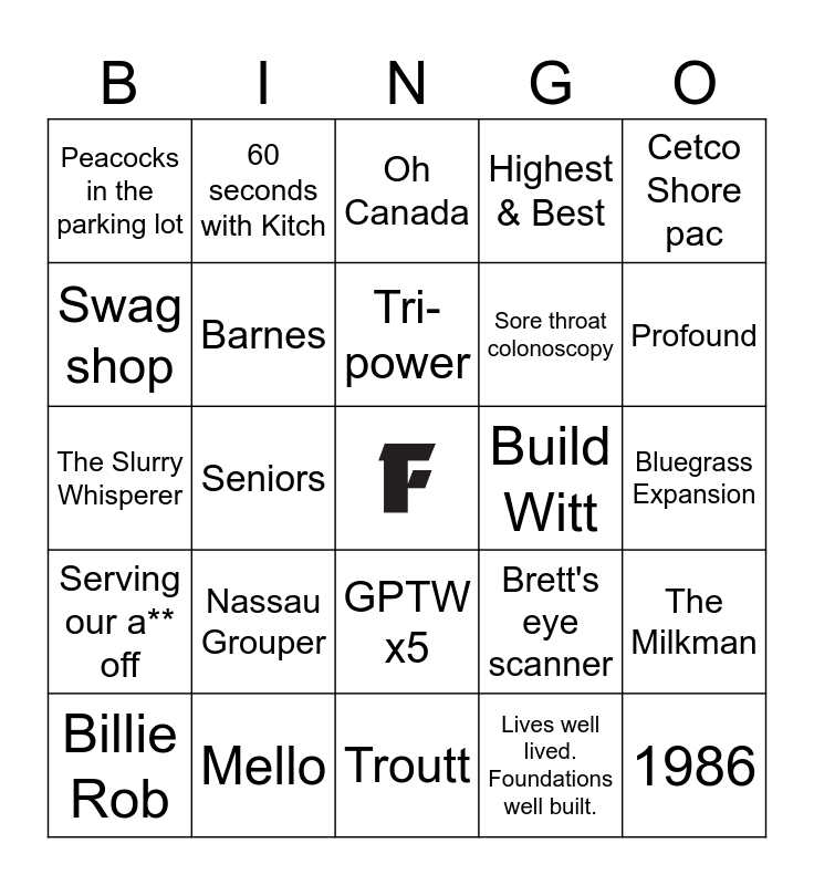 This bingo card has a free space and 24 words: Nassau Grouper, Mello, Tri-power, Billie Rob, Cetco Shore pac, Peacocks in the parking lot, Swag shop, 60 seconds with Kitch, Build Witt, GPTW x5, Sore throat colonoscopy, The Slurry Whisperer, Brett's eye scanner, The Milkman, Barnes, Lives well lived. Foundations well built., Bluegrass Expansion, Oh Canada, Profound, Seniors, 1986, Serving our a** off, Highest & Best and Troutt.