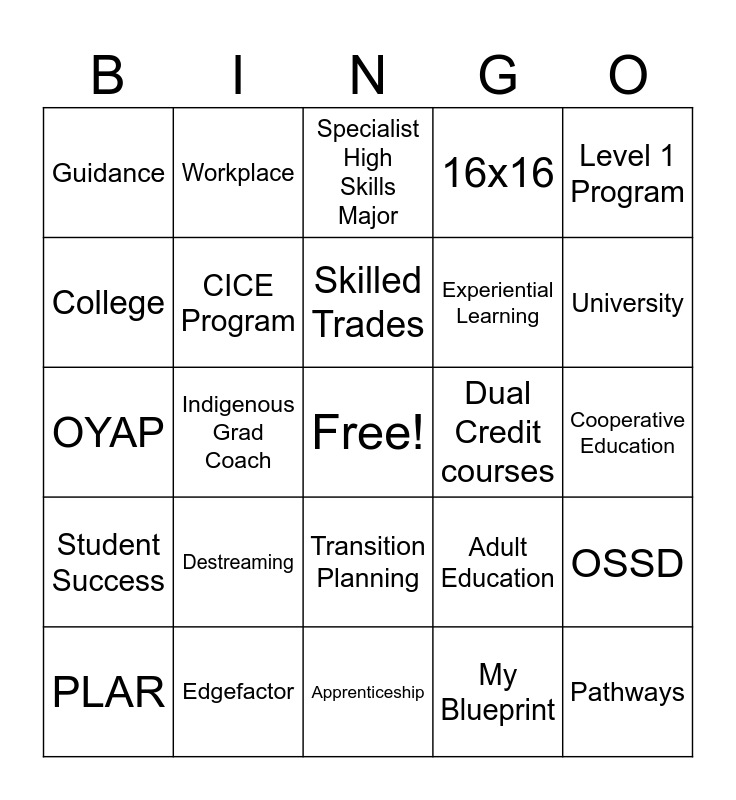 This bingo card has a free space and 24 words: Destreaming, Edgefactor, Skilled Trades, PLAR, Level 1 Program, Guidance, College, Workplace, Dual Credit courses, Transition Planning, Experiential Learning, OYAP, Adult Education, OSSD, CICE Program, My Blueprint, Cooperative Education, Specialist High Skills Major, University, Indigenous Grad Coach, Pathways, Student Success, 16x16 and Apprenticeship.