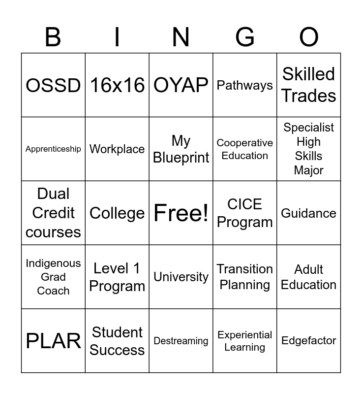 This bingo card has a free space and 24 words: Level 1 Program, Student Success, My Blueprint, PLAR, Skilled Trades, OSSD, Apprenticeship, 16x16, CICE Program, University, Cooperative Education, Dual Credit courses, Transition Planning, Adult Education, Workplace, Experiential Learning, Guidance, OYAP, Specialist High Skills Major, College, Edgefactor, Indigenous Grad Coach, Pathways and Destreaming.