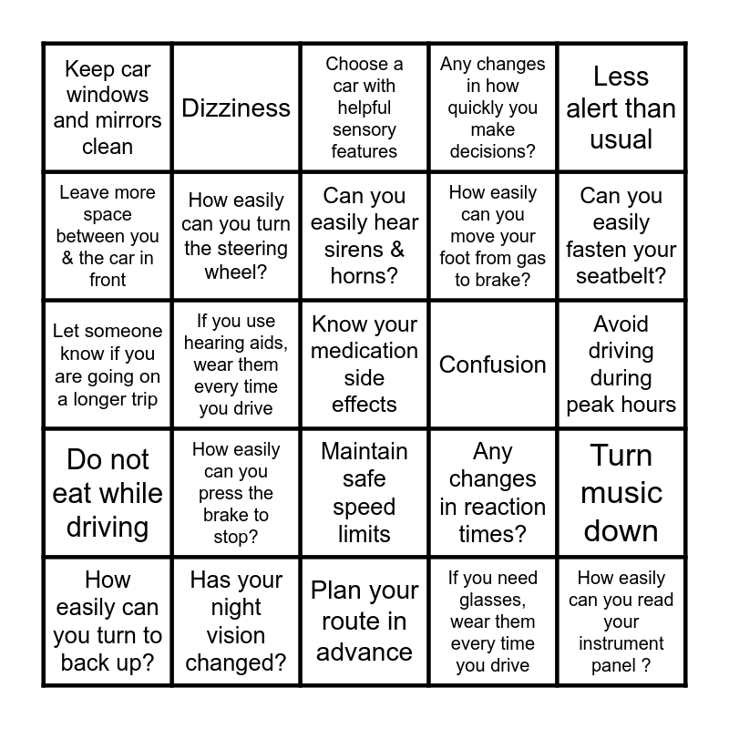 This bingo card has a free space and 51 words: Get your hearing checked yearly, How easily can you read your instrument panel ?, Shakiness, Plan your route in advance, How easily can you press the brake to stop?, Pull over to check your blood sugar if it feels high or low, Dizziness, How easily can you see in your blind spots?, Leave more space between you & the car in front, Diabetic: Take your testing kit & snacks, How easily can you turn the steering wheel?, Any changes in how quickly you make decisions?, Turn music down, Any changes in reaction times?, Have your driving checked by an occupational therapist, Get an annual eye exam, Can you easily hear sirens & horns?, Confusion, Feeling off balanced, Less alert than usual, If you use hearing aids, wear them every time you drive, If you need glasses, wear them every time you drive, Keep car windows and mirrors clean, How easily can you move your foot from gas to brake?, Do you easily remember the purpose of your trip?, Drive when pain symptoms are milder, Can you easily fasten your seatbelt?, Always wear your seatbelt, How easily can you turn to back up?, Choose a car with helpful sensory features, Discuss medication side effects with your doctor, Physically or mentally tired, Wear sunglasses on bright days, Choose glasses frames with narrow sides, Perform routine car maintenance, Has your night vision changed?, Talk to your doctor about numbness in hands or feet, Check your blood sugar before driving, Drive during daylight, Drive during fair weather, Avoid driving during peak hours, Do not eat while driving, Request lower volume from any loud passengers, Exercise to maintain strength & flexibility, Leave plenty of space for braking, Drive an automatic transmission, Let someone know if you are going on a longer trip, Check in with yourself, Know your health condition symptoms, Maintain safe speed limits and Take a driver refresher course.