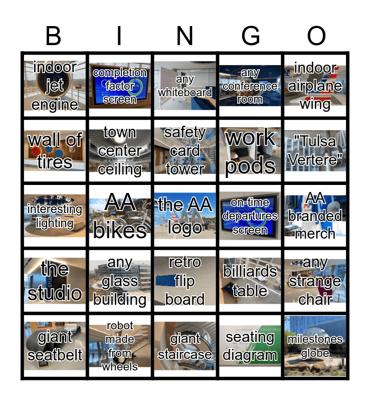 This bingo card has 24 images, a free space and 24 words: any glass building, robot made from wheels, safety card tower, giant seatbelt, indoor airplane wing, indoor jet engine, wall of tires, completion factor screen, on-time departures screen, retro flip board, work pods, interesting lighting, billiards table, any strange chair, town center ceiling, seating diagram, AA branded merch, any whiteboard, "Tulsa Vertere", AA bikes, milestones globe, the studio, any conference room and giant staircase.