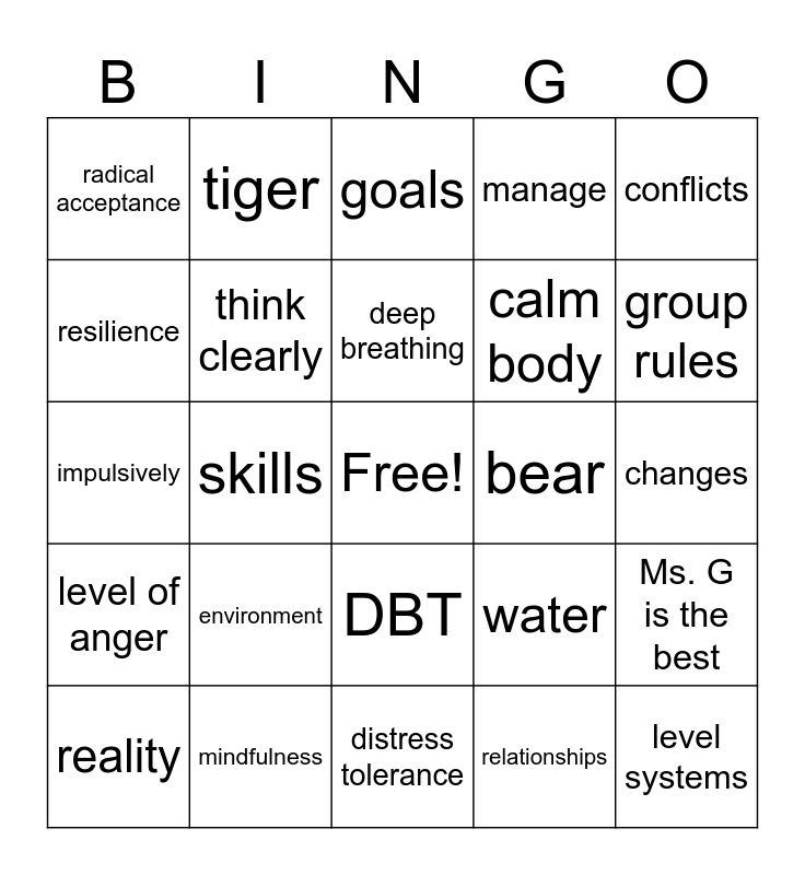 This bingo card has a free space and 24 words: environment, mindfulness, deep breathing, reality, conflicts, radical acceptance, resilience, tiger, bear, DBT, calm body, impulsively, water, Ms. G is the best, think clearly, relationships, changes, goals, group rules, skills, level systems, level of anger, manage and distress tolerance.