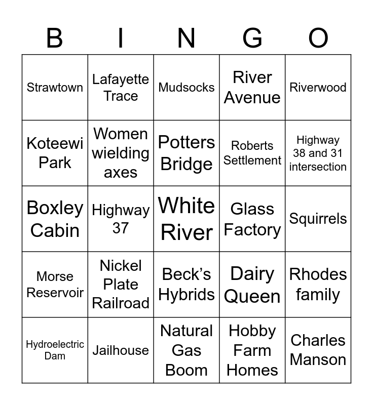 This bingo card has 25 words: Nickel Plate Railroad, Natural Gas Boom, Potters Bridge, Hydroelectric Dam, Riverwood, Strawtown, Koteewi Park, Lafayette Trace, Glass Factory, Beck’s Hybrids, Roberts Settlement, Boxley Cabin, Dairy Queen, Rhodes family, Women wielding axes, Charles Manson, Squirrels, Mudsocks, Highway 38 and 31 intersection, Highway 37, White River, Jailhouse, Morse Reservoir, River Avenue and Hobby Farm Homes.