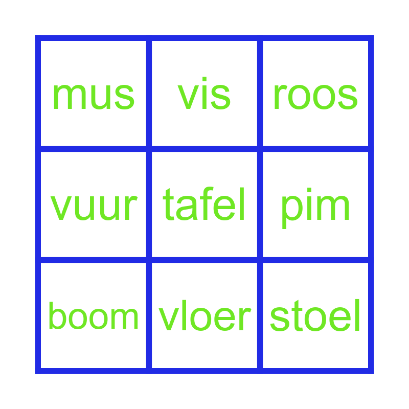 This bingo card has 9 words: boom, roos, vis, vuur, mus, pim, tafel, stoel and vloer.