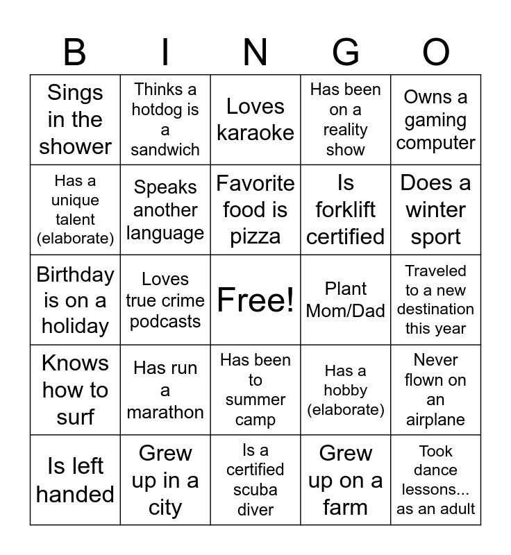 This bingo card has a free space and 39 words: Lived in another country, Has a pet, Has a tattoo, Speaks another language, Is left handed, Has been to summer camp, Favorite food is pizza, Favorite food is sushi, Owns a gaming computer, Knows how to surf, Loves true crime podcasts, Has been on a reality show, Took dance lessons... as an adult, Traveled to a new destination this year, Plant Mom/Dad, Has run a marathon, Has been at Zendesk for more than a decade, Sings in the shower, Read 10+ books this year, Has a hobby (elaborate), Has a unique talent (elaborate), Is a certified scuba diver, Is forklift certified, Does a winter sport, Does a water sport, Believes in ghosts, Double jointed, Does not drink coffee, Has a uniquely named wifi network (must share), Thinks a hotdog is a sandwich, Has a bad pickup line (must share), Has been to the Olympics, Loves karaoke, Grew up in a city, Grew up on a farm, Has a side hustle, Never flown on an airplane, Birthday is on a holiday and Is a twin or triplet.