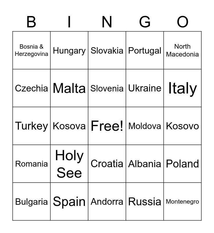 This bingo card has a free space and 28 words: Poland, Belarus, Ukraine, Russia, Czechia, Slovakia, Hungary, Romania, Moldova, Bulgaria, Turkey, Portugal, Spain, Andorra, Italy, San Marino, Holy See, Malta, Slovenia, Croatia, Bosnia & Herzegovina, Serbia, Montenegro, Kosova, Kosovo, Albania, North Macedonia and Greece.