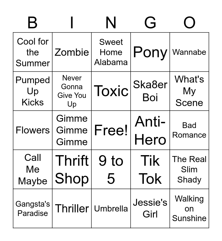 This bingo card has a free space and 41 words: New Rules, Flowers, Greased Lightnin', Never Gonna Give You Up, Thriller, 9 to 5, Toxic, Sweet Caroline, Wannabe, Call Me Maybe, Gimme Gimme Gimme, Pony, Walking on Sunshine, Bad Romance, Anti-Hero, Thrift Shop, No Scrubs, Cool for the Summer, I'm Like A Bird, Sweet Home Alabama, The Real Slim Shady, Brown Eyed Girl, Umbrella, Ska8er Boi, The Horses, Treaty, Jessie's Girl, Run To Paradise, What's My Scene, Mambo No. 5, Single Ladies, Zombie, Gangsta's Paradise, All Star, Tik Tok, Pumped Up Kicks, 4 Minutes, Bohemian Rhapsody, Africa, YMCA and Rolling in the Deep.
