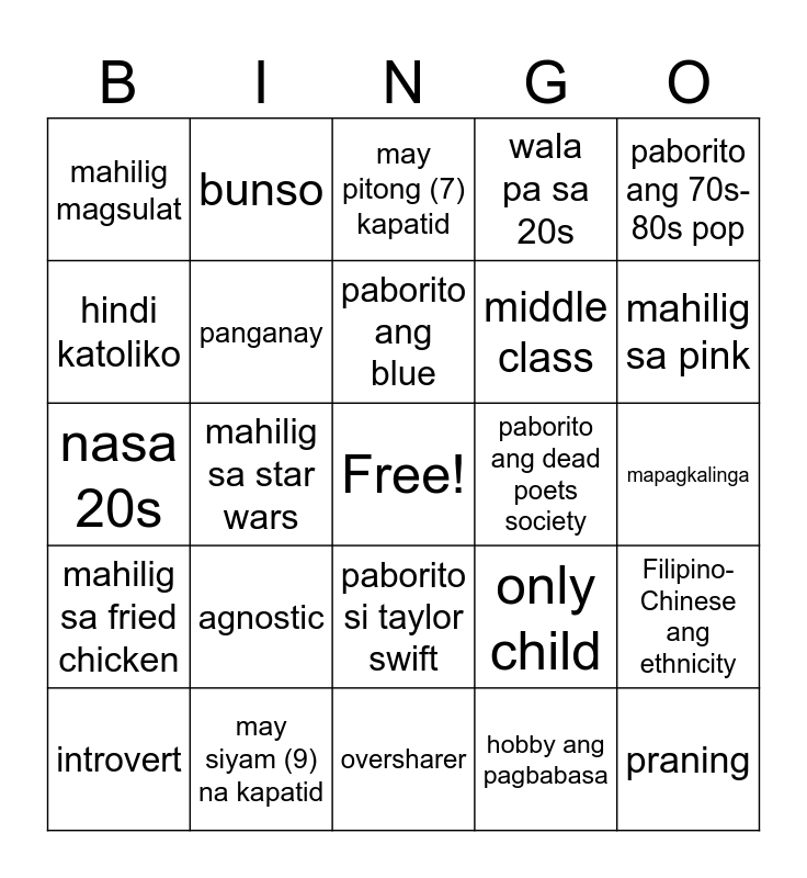 This bingo card has a free space and 25 words: agnostic, oversharer, paborito ang blue, introvert, paborito ang 70s-80s pop, mahilig magsulat, hindi katoliko, bunso, paborito ang dead poets society, paborito si taylor swift, middle class, nasa 20s, only child, Filipino-Chinese ang ethnicity, panganay, hindi heterosexual, mapagkalinga, may pitong (7) kapatid, mahilig sa pink, mahilig sa star wars, praning, may siyam (9) na kapatid, mahilig sa fried chicken, wala pa sa 20s and hobby ang pagbabasa.
