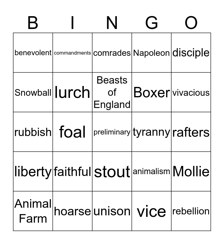 This bingo card has 30 words: hoarse, hideous, foal, miserable, benevolent, comrades, lurch, stout, tyranny, unison, rafters, preliminary, vice, rebellion, vivacious, shrill, animalism, liberty, faithful, disciple, rubbish, unanimous, commandments, Boxer, Snowball, Napoleon, Mollie, Animal Farm, Beasts of England and Old Major.