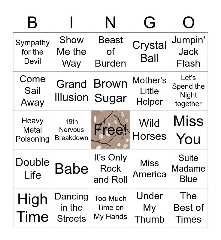 This bingo card has a free space and 50 words: Lady, The Best of Times, Lorelei, Too Much Time on My Hands, Babe, Fooling Yourself, Show Me the Way, Renegade, Come Sail Away, Blue Collar Man, Grand Illusion, Crystal Ball, Suite Madame Blue, Miss America, Mr. Roboto, Don't Let It End, Brown Sugar, Wild Horses, I Can't Get Know Satisfaction, Jumpin' Jack Flash, 19th Nervous Breakdown, Under My Thumb, Sympathy for the Devil, Mother's Little Helper, Get Off of My Cloud, Paint It, Black, Let's Spend the Night together, Start Me Up, Beast of Burden, It's Only Rock and Roll, Undercover, Rockin' the Paradise, Snowblind, Rock and A Hard Place, Dancing in the Streets, Angry, Waiting on a Friend, Shattered, When the Whip Comes Down, Miss You, Some Girls, Gimme Shelter, You Can't Always Get What You Want, Hang Fire, High Time, Heavy Metal Poisoning, Haven't We Been Here Before, Just Get Through This Night, Double Life and Queen of Spades.