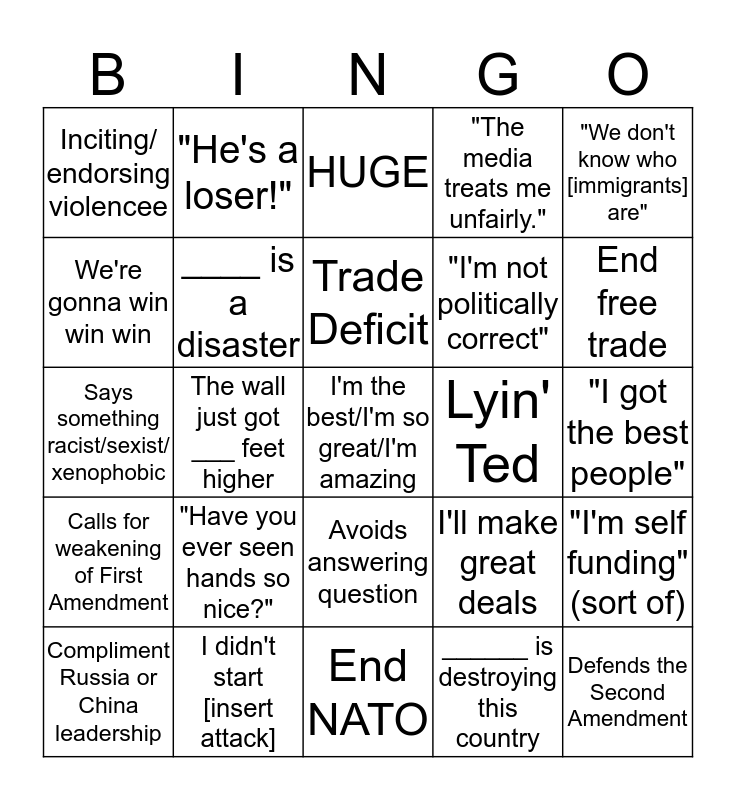 This bingo card has a free space and 24 words: "Have you ever seen hands so nice?", I didn't start [insert attack], Trade Deficit, Compliment Russia or China leadership, "We don't know who [immigrants] are", Inciting/ endorsing violencee, We're gonna win win win, "He's a loser!", Lyin' Ted, Avoids answering question, "I'm not politically correct", Says something racist/sexist/ xenophobic, I'll make great deals, "I'm self funding" (sort of), ____ is a disaster, ______ is destroying this country, "I got the best people", HUGE, End free trade, The wall just got ___ feet higher, Defends the Second Amendment, Calls for weakening of First Amendment, "The media treats me unfairly." and End NATO.